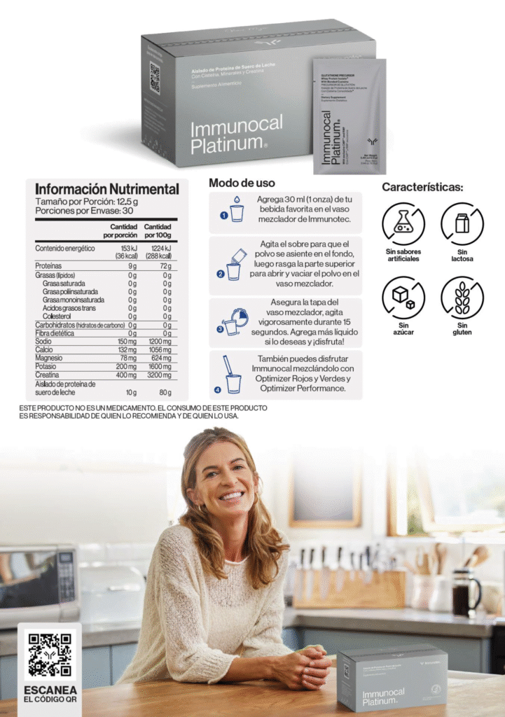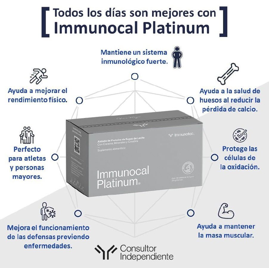 Immunocal Platinum: todo lo que necesitas para ayudarte a estar mas sano, mas fuerte, con mas vitalidad y con un envejecimiento saludable. Immunocal Platinum te brinda la ventaja de Immunocal MX y dos componentes adicionales: Peptidos moduladores de citocinas(CMP) y formula moduladora de redox (RMF). La mezcla de estos ingredientes, en conjunto con un estilo de vida saludable uy una dieta balanceada, tienen las siguientes ventajas: