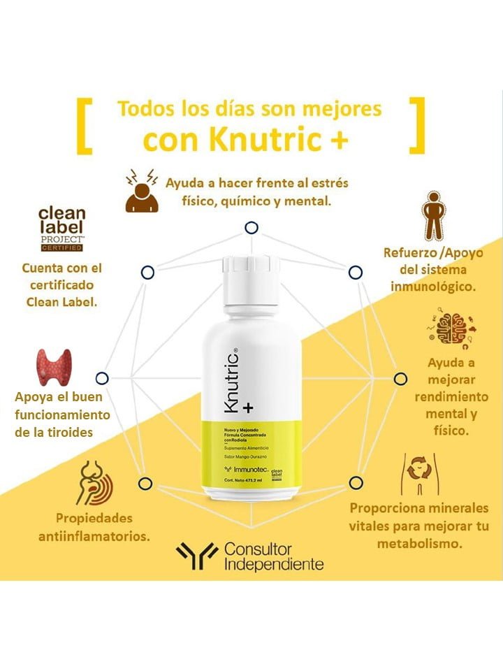 KNUTRIC+ es una exclusiva mezcla mineral herbal que incluye rhodiola conocida por su notable capacidad adaptogenica. Su formula contiene 21 componentes para ayudar a mejorar tu capacidad de enfoque y manejar el stress, un concentrado exclusivo de extractos herbales, Yodo, Potasio (K), Magnesio (Mg), Sodio (Na) y Boro (B).