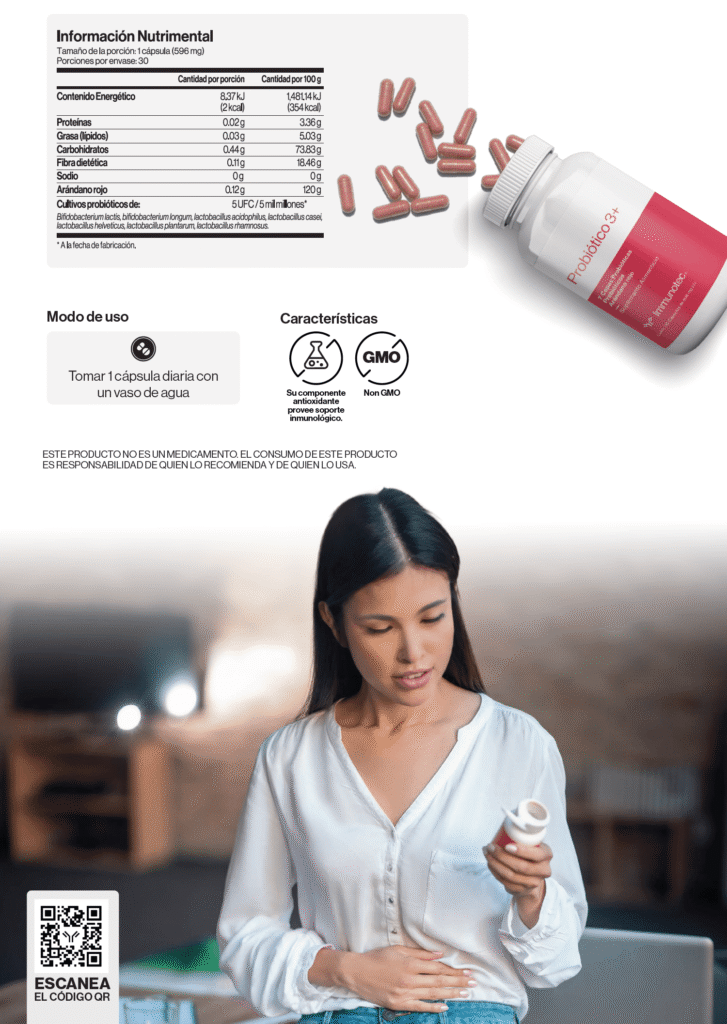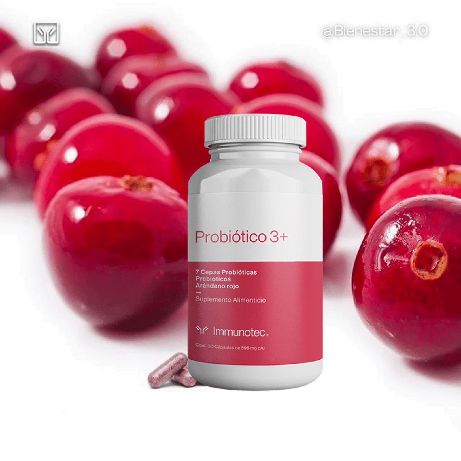 Probiotico 3+ producto único que combina 7 cepas probióticas, un prebiótico y extracto de arándano rico en antioxidantes. En conjunto equilibran el ecosistema intestinal, mejoran la digestión y combaten el stress oxidativo para lograr un bienestar óptimo.